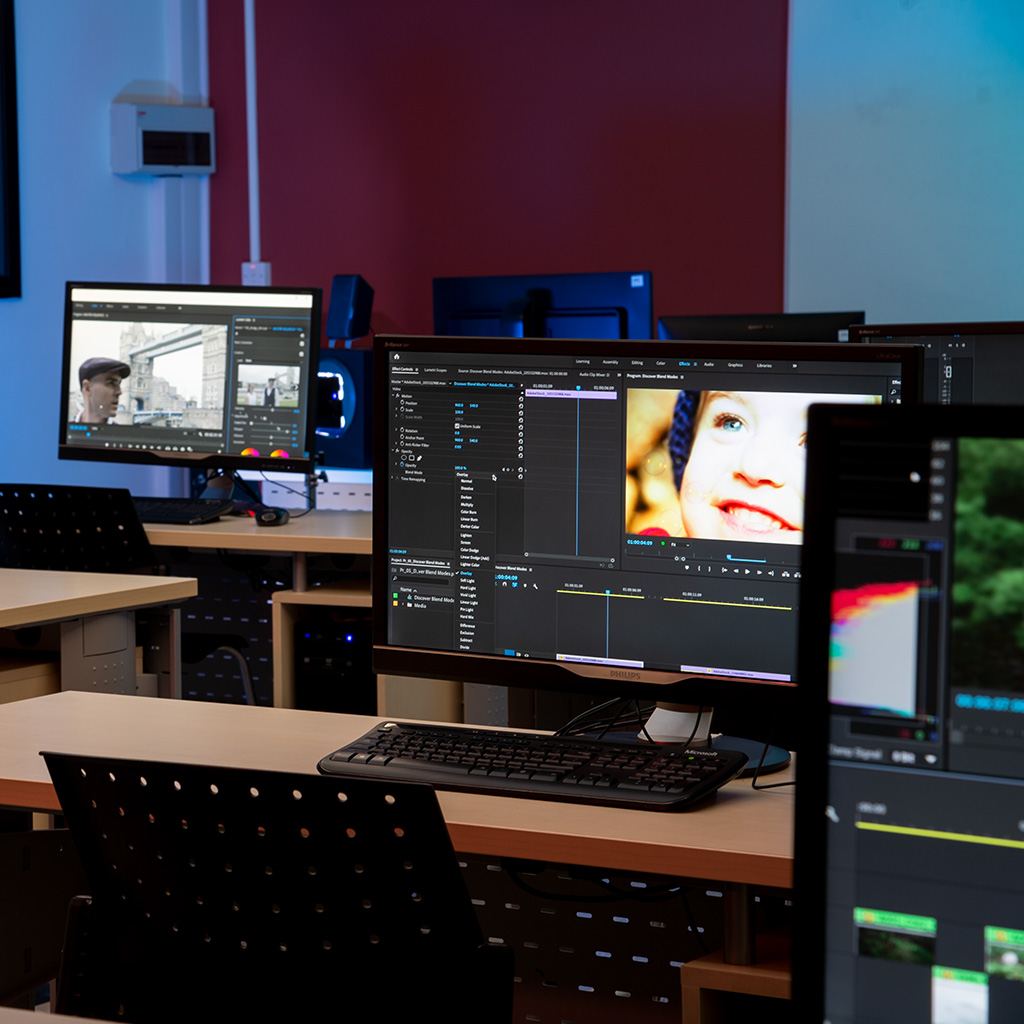 The Digital Lab provides a collaborative and fully equipped space for students to carry out editing and post-production work at a professional level. The lab is complete with 16 high-performance workstations, each paired with a 4K monitor to support precise video editing, design, and multimedia production tasks. This setup ensures that students have access to the processing power and visual clarity required for demanding creative projects.